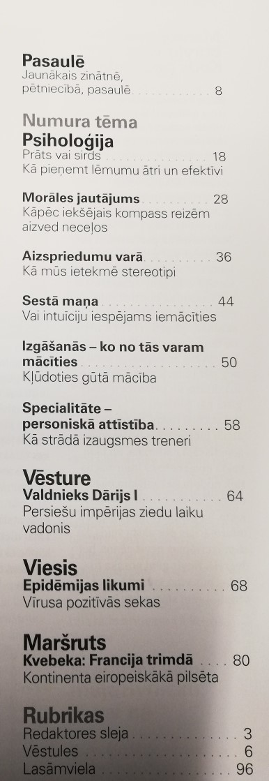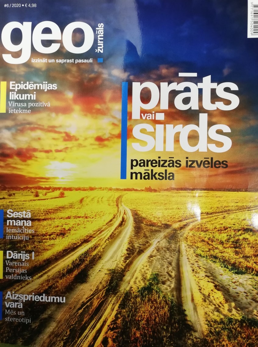Šoreiz neliels ieskats “GEO” lappusēs - jaunākais numurs vēsta ne tikai par epidēmijas likumiem (ir vērts iepazīties ar pagātnes epidēmijām, lai saprastu, ka tomēr ir iemesls optimismam nākotnē) un aizspriedumu neierobežoto varu (izrādās ir iespējams pieņemt lēmumus, kas nebalstās uz stereotipiem), bet arī par kļūdu lietderību (neizdošanās bieži rada jaunu iespēju) un mākslu pareizi izvēlēties. Pētījumi liecina, ka lēmumus ir grūti pieņemt, jo pārāk daudz un ilgi apsveram visus argumentus. Eksperti ir definējuši 5 ieteikumus, kurus ievērojot, varam pieņemt sev patīkamu lēmumu: nepaļauties tikai uz racionālo prātu; ieklausīties izjūtās; meklēt universālas sakarības; netiekties pēc perfekcijas un atrast vienu labu iemeslu (ignorēt visus pārējos).